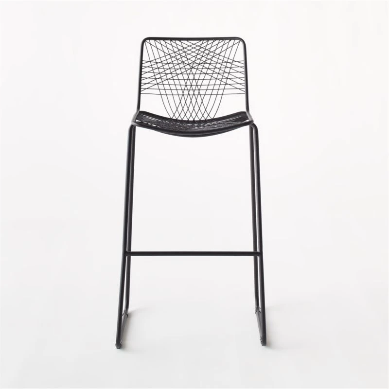 Iron frame with wire seat and back, expertly woven and welded into a graphic linear pattern. Finished in black, bar stool pulls up beautifully to white and natural wood surfaces. CB2 exclusive.