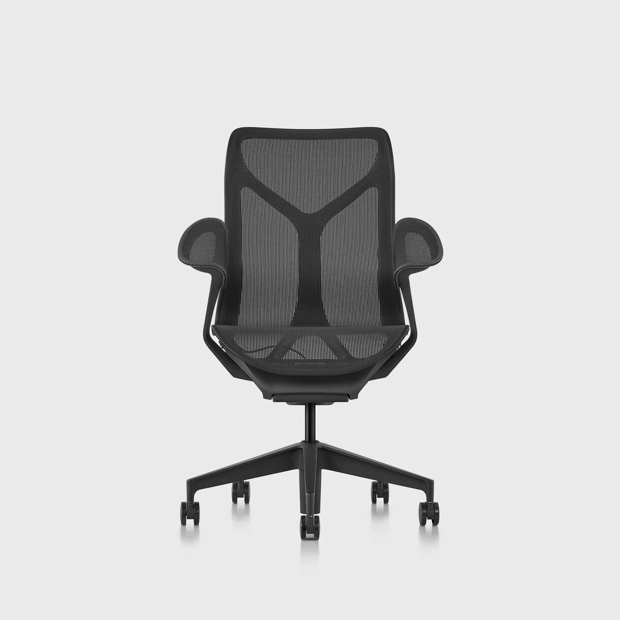 Cosm’s ergonomic support goes beyond mechanics. The frame and fabric suspension work in tandem with the Auto-Harmonic Tilt. The continuous suspension material, Herman Miller’s new Intercept™, forms to each person’s unique contours, delivering dynamic, uninterrupted support. Intercept delivers thermal comfort while standing up to years of use. The hourglass-shaped suspension attaches to the frame, creating areas of high- and low-tension that provide comfort and support where it is needed most—regardless of body size or position in the chair.