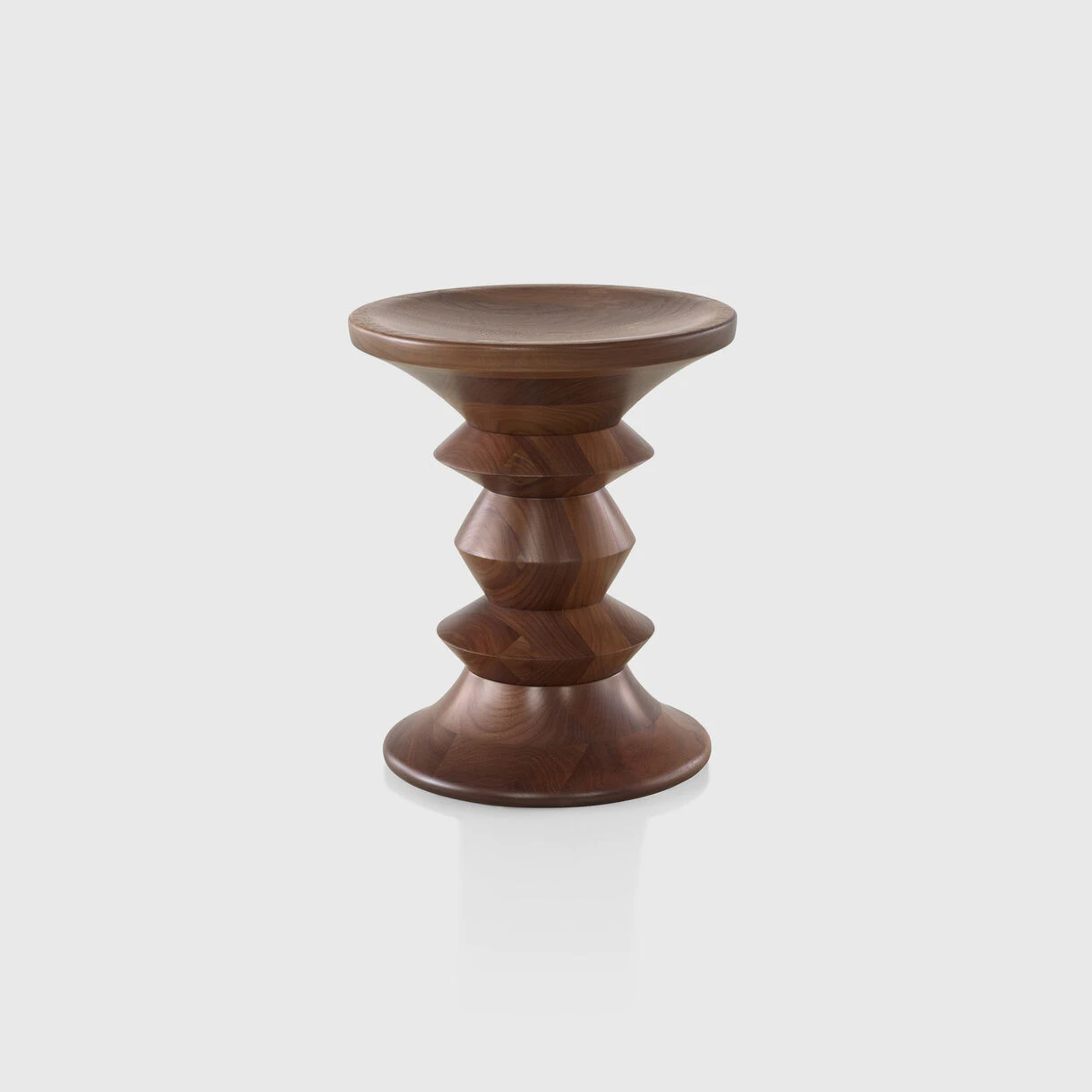 Are they really stools? Places to sit? Are they tables? Plant stands? Accent pieces for homes, offices or lobbies? Yes. They’ve been called abstract chess pieces. Well, no. The centre section of the Eames Turned Stool is crafted in three distinctively shaped profiles. Choose the one you like, or choose two or three – the same or different. The Eames Turned Stool is made of turned walnut or ebonised ash; pick it up and you can instantly tell that it’s solid wood.