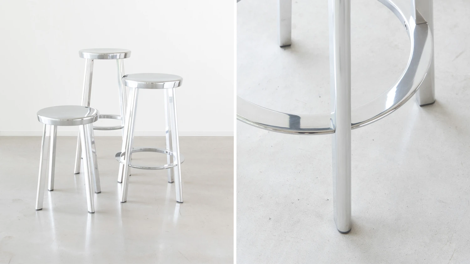 Deja-vu: a simple, highly iconic stool with seat in die-cast aluminium and legs in extruded aluminium, available both in polished and painted version (the latter suitable for outdoor use).