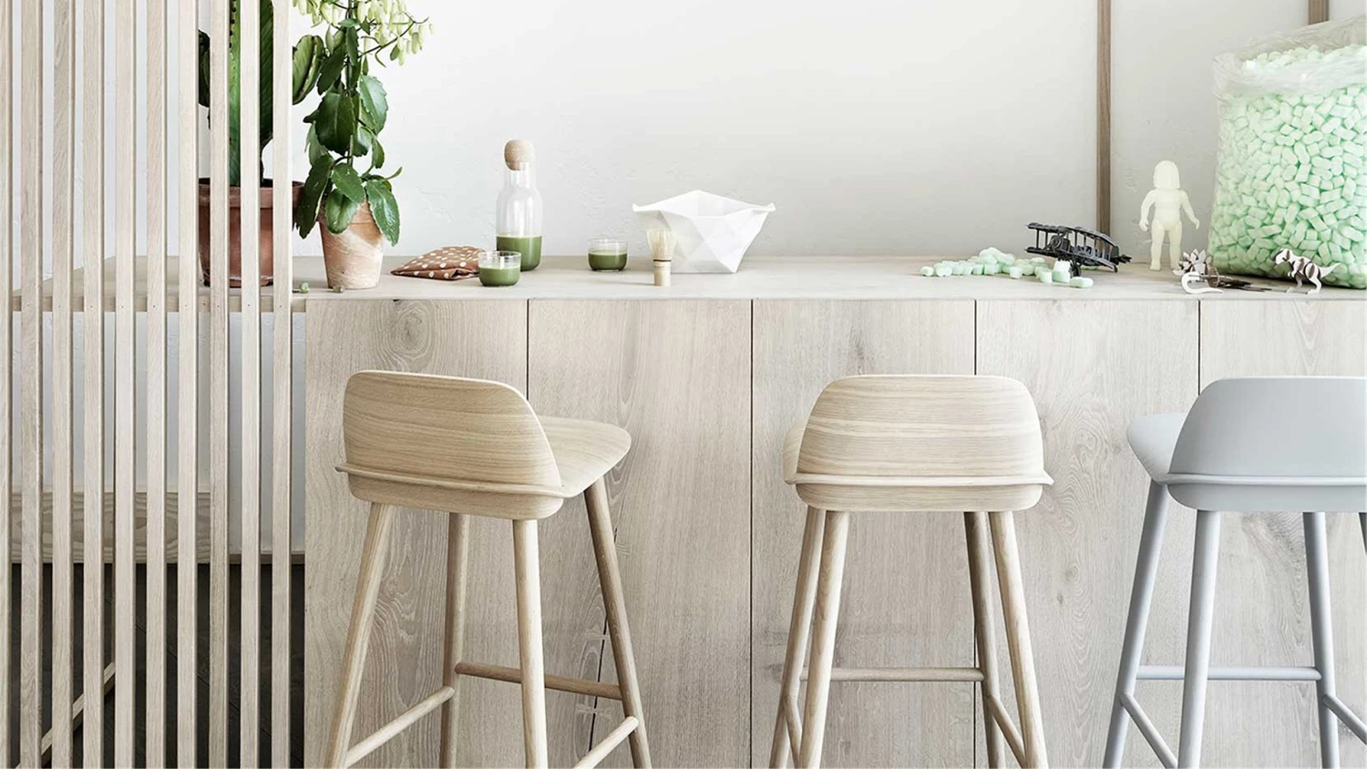 The form of the Nerd Bar Stool invites the user to sit from several angles, this adaptability is helped by the soft, curvy plywood shell. The low backrest of the bar stool gives support and comfort.