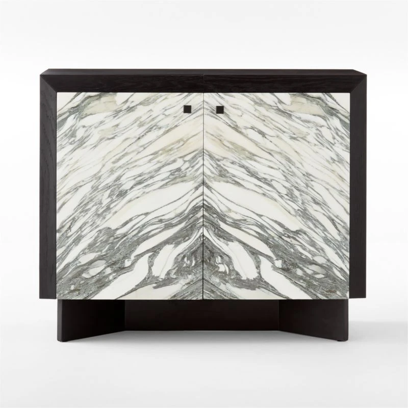 Boxy bar cabinet by Jannis Ellenberger embraces contrasts of texture and tone. A frame of blackened ash wood, certified sustainable by the Forest Stewardship Council ® (FSC), has a smooth surface that showcases the wood grain’s variation. Soft-close doors are covered with Italian Arabescato marble veneer, precisely book-matched to emphasize the beauty of natural stone. Within the cabinet, two adjustable shelves provide ample storage. A dramatic addition to the dining room, the cabinet could also serve as a statement piece for the entryway. CB2 exclusive.