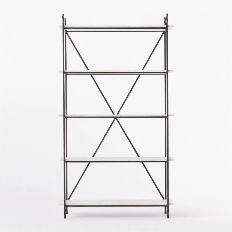 Solid iron etagere with smoked grey patina finish and modern twist detailing. Designed by Mermelada Estudio, five white marble shelves with subtle grey activity extend just beyond the frame. Works beautifully in the kitchen, dining or living room. Learn more about Mermelada Estudio on our blog. CB2 exclusive.